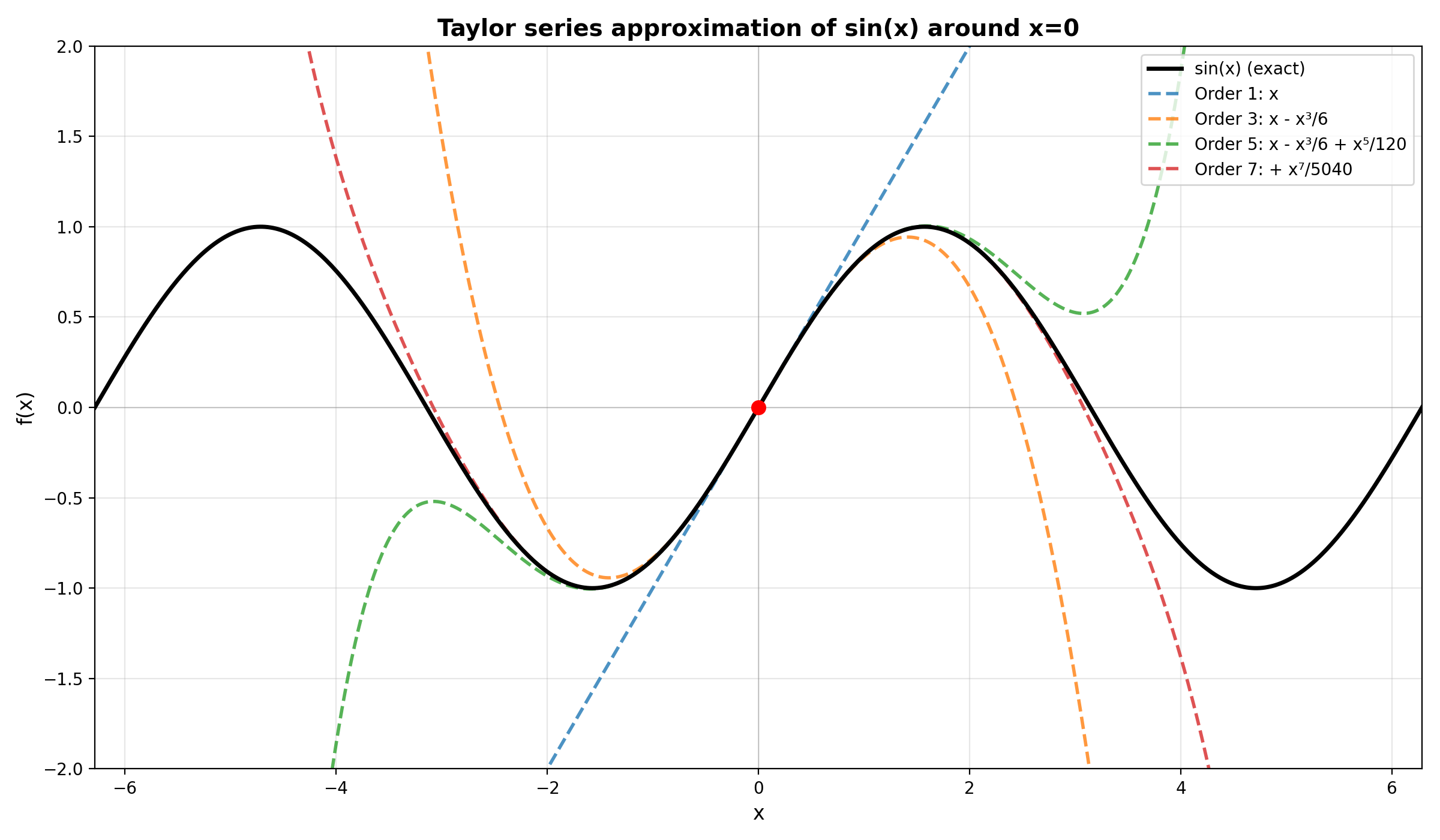 The plot shows how higher-order Taylor polynomials progressively match \(\sin(x)\) over a wider range. Near \(x = 0\), even the linear approximation (\(f(x) \approx x\)) is quite good. Far from the expansion point, higher-order terms are essential.