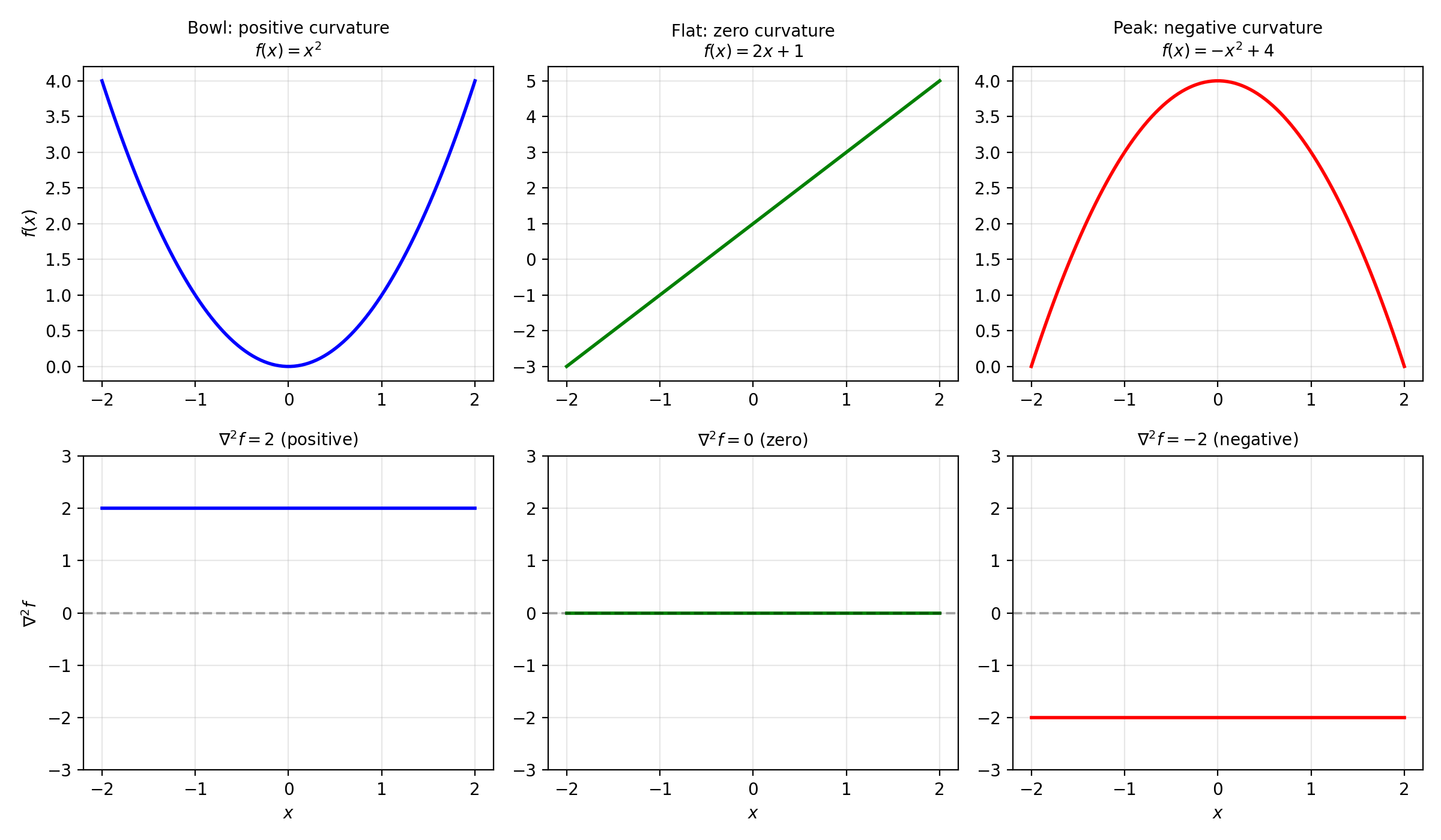 The top row shows three functions with different curvatures. The bottom row shows their Laplacian values. A bowl curves upward (positive Laplacian), a flat line has no curvature (zero Laplacian), and a peak curves downward (negative Laplacian).
