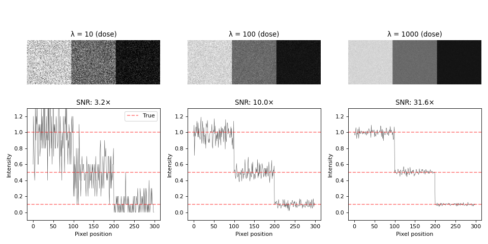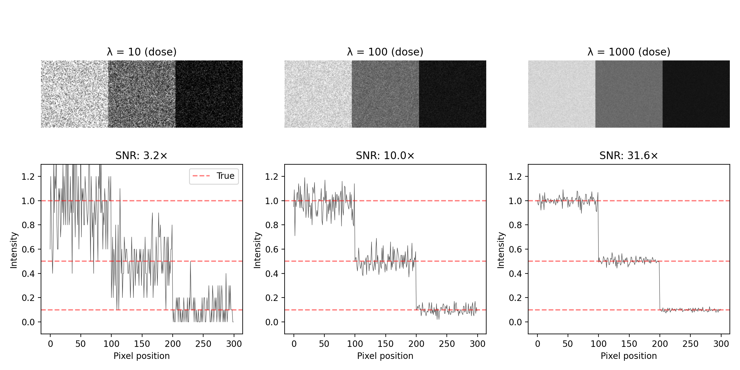 The challenge is balancing dose (signal quality) with sample damage. Lower dose means less radiation damage and faster acquisition, but more shot noise in each diffraction pattern. Denoising can recover signal quality without increasing dose.