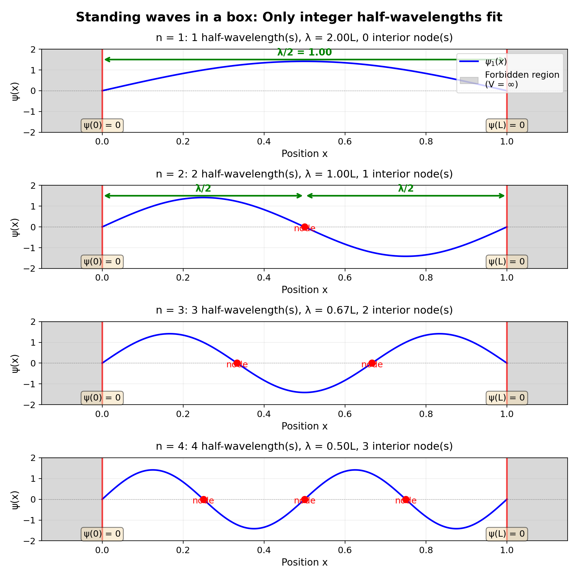 Just like a guitar string fixed at both ends, only certain wavelengths “fit” in the box. Wavelengths that don’t satisfy the boundary conditions would create destructive interference and cannot exist as stable states.
