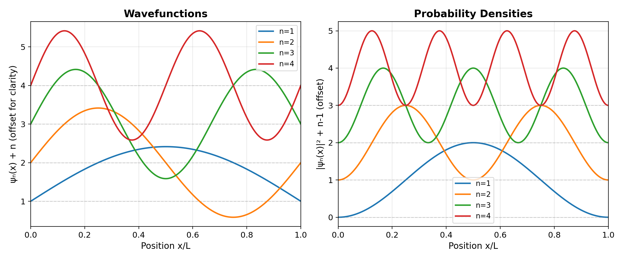 The left panel shows the wavefunctions \(\psi_n(x)\) for the first four quantum states. Each wavefunction has \(n\) half-wavelengths fitting in the box, with \(n-1\) nodes (zero crossings). The right panel shows the probability densities \(|\psi_n(x)|^2\), indicating where the particle is most likely to be found. For the ground state (\(n=1\)), the particle is most probable at the center. Higher energy states show multiple peaks and nodes.