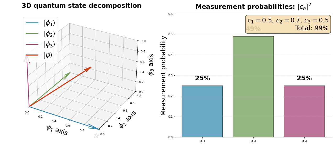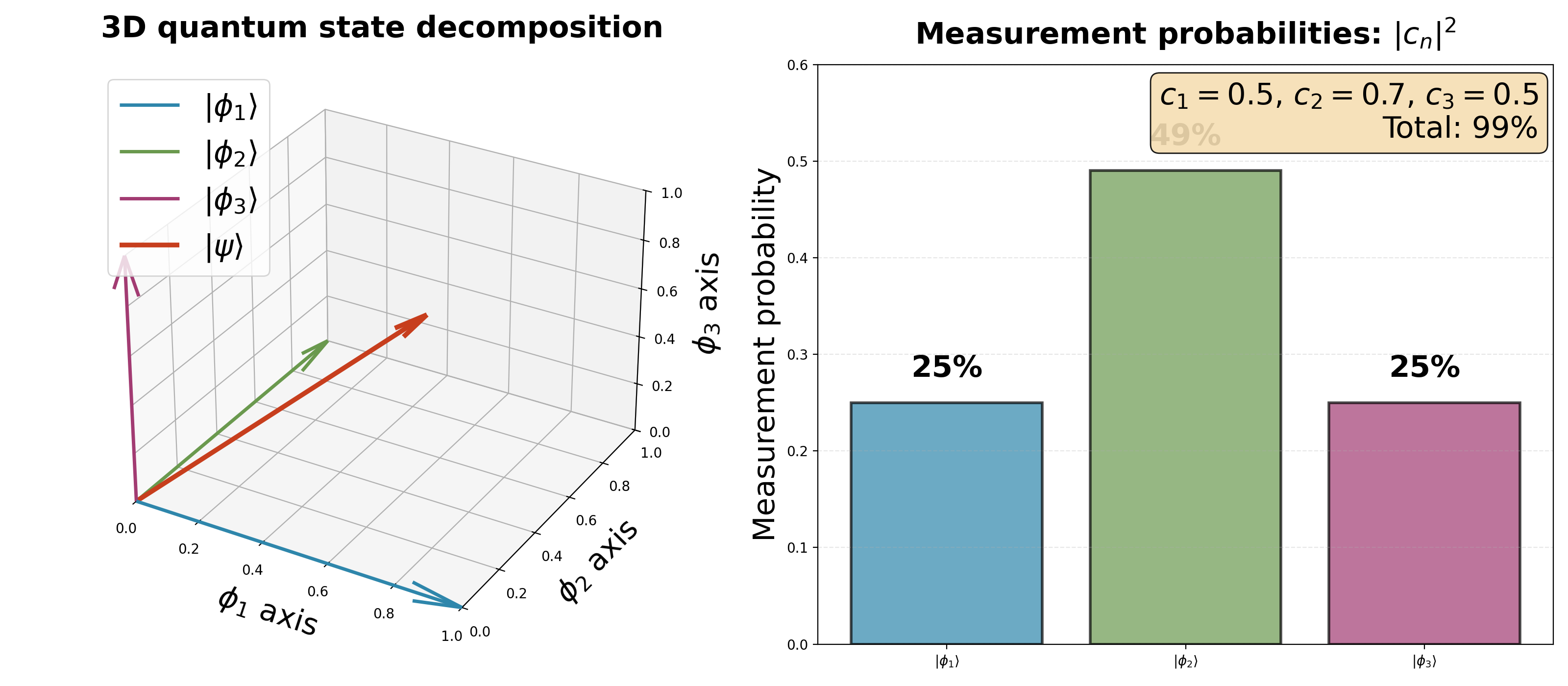 Physical meaning: We observe that a quantum system can exist in a superposition of multiple states simultaneously. The particle isn’t “in state 1” or “in state 2” — we see it’s in both at once until we measure it.