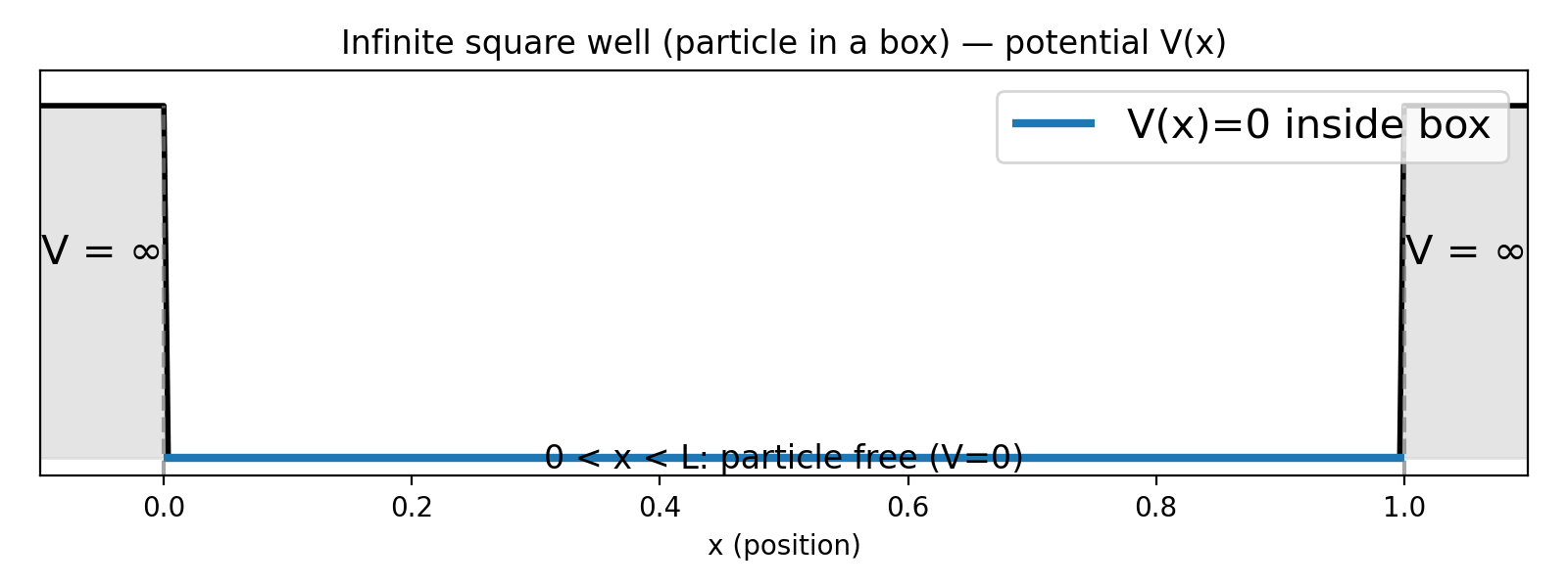 The figure above shows the infinite square well potential used in the particle-in-a-box model: \(V(x)=0\) for \(0 < x < L\) and \(V(x)=\infty\) outside. This is the model/postulate that enforces the boundary conditions \(\psi(0)=\psi(L)=0\) (the particle cannot be found where the potential is infinite).