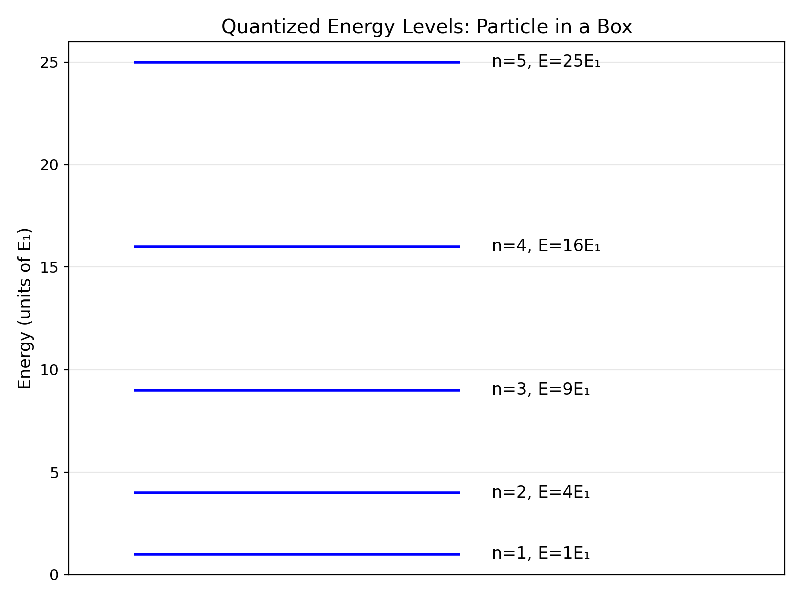 Physical intuition: Like a guitar string, only certain “notes” (energies) are allowed. The box imposes boundary conditions that select discrete wavelengths, which correspond to discrete momenta and therefore discrete energies.