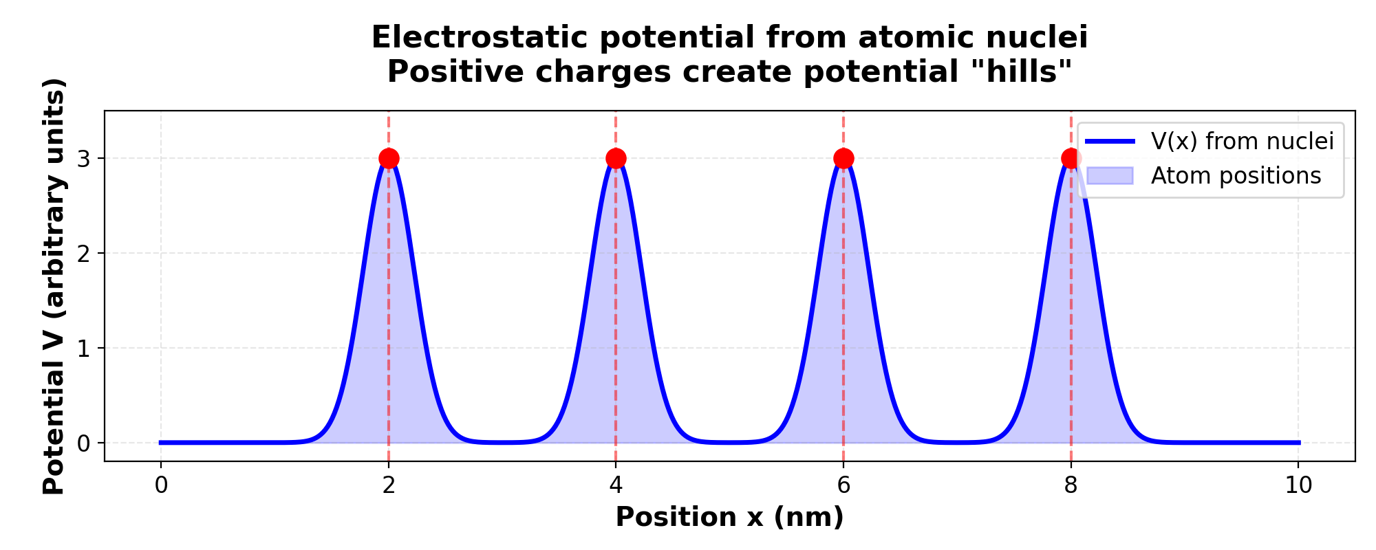 where \(q = 1.602 \times 10^{-19}\) C is the elementary charge magnitude (positive). The electron carries charge \(-q\) (negative). Important: The total energy \(E_{\text{total}}\) is conserved—it remains constant throughout the sample. However, the electron’s kinetic energy temporarily changes as it interacts with the potential. Near a positively charged nucleus (where \(V > 0\), a potential “hill”), the negatively charged electron is attracted and speeds up, gaining kinetic energy (the \(-qV\) term becomes more negative, so \(E_{\text{kinetic}}\) increases). Far from nuclei (between atoms), it slows down. Think of it like a ball rolling through a landscape of hills and valleys—the ball speeds up going downhill and slows down going uphill, but its total energy stays constant.