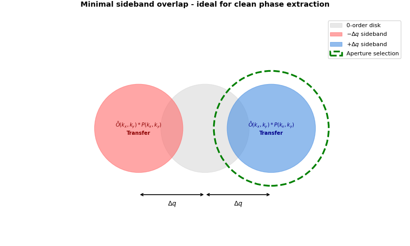 Select one sideband using a circular aperture, shift it to the center, then divide by the probe intensity: \(\tilde{O}(\mathbf{k}) = S(\mathbf{k}) / |P(\mathbf{k})|^2\). This removes the probe’s influence and isolates the object’s Fourier transform. The probe \(P(\mathbf{k})\) must be either measured from a vacuum region or constructed from known aberration coefficients.
