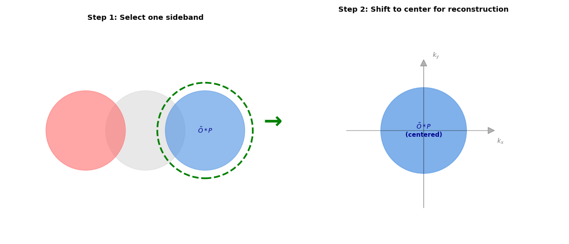 The center disk \(|P|^2\) is purely real - magnitude squared destroys phase. But the sidebands contain the complex object-probe product \(\tilde{O}(\mathbf{k}) * P(\mathbf{k})\), which preserves both amplitude AND phase.