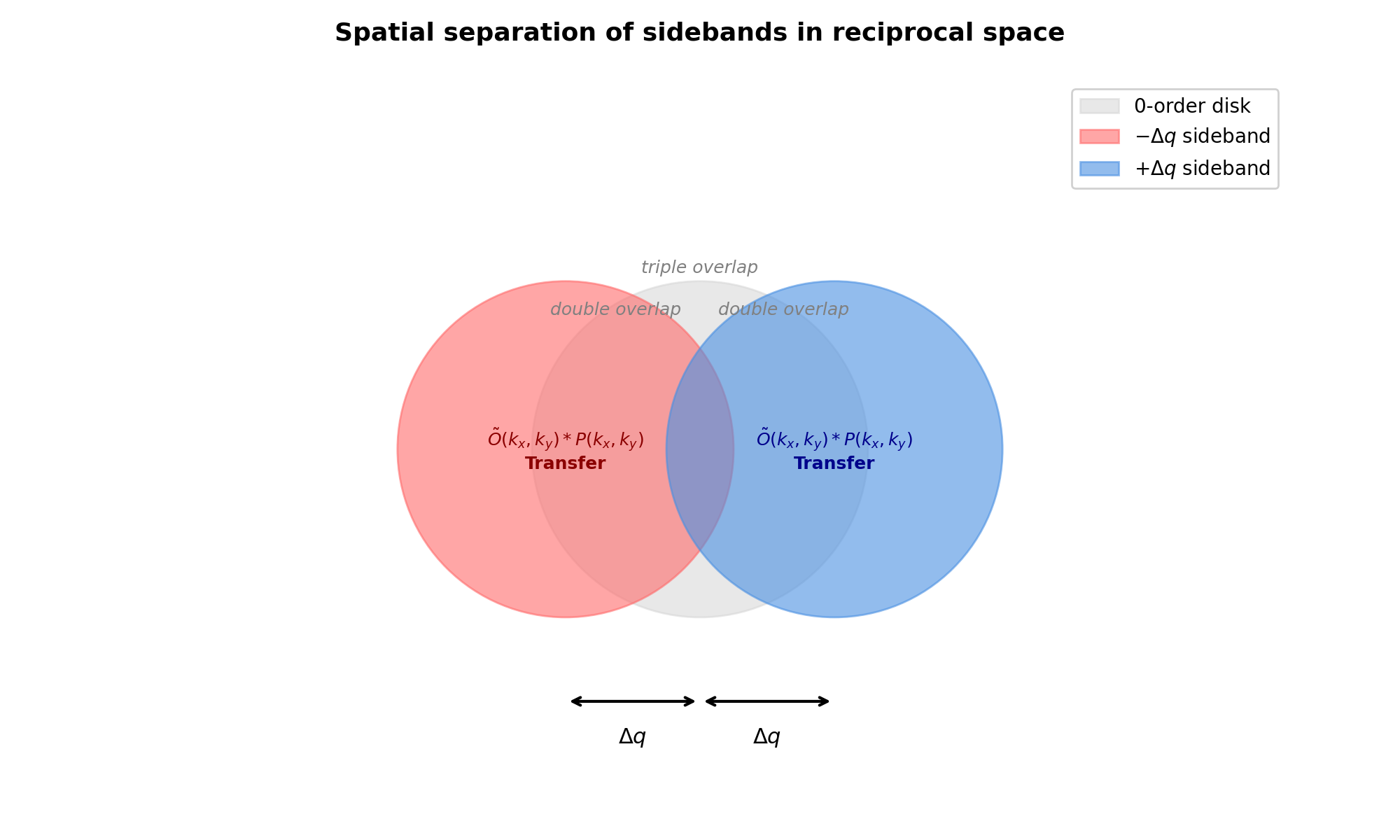 The result is three overlapping disks in the 4D \((\mathbf{k}, \mathbf{Q})\) space. The delta functions below are idealizations (in reality the sidebands have finite width):
