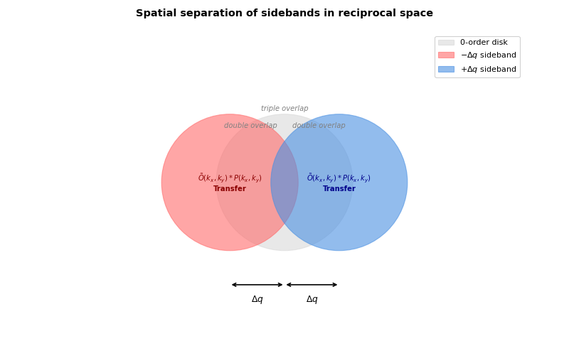 Fourier transform over all scan positions: \(G(\mathbf{k}, \mathbf{Q}) = \mathcal{F}_{\mathbf{R} \to \mathbf{Q}}[I(\mathbf{k}; \mathbf{R})]\). This separates the signal into three components: